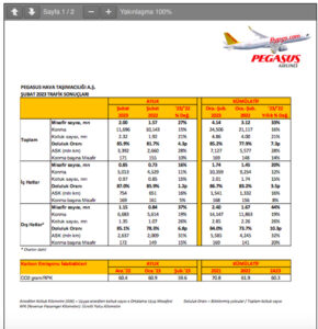 Pegasus Hava Yolları, Şubat ayına ilişkin trafik rakamlarını Kamuyu Aydınlatma Platformu’na (KAP) açıkladı.