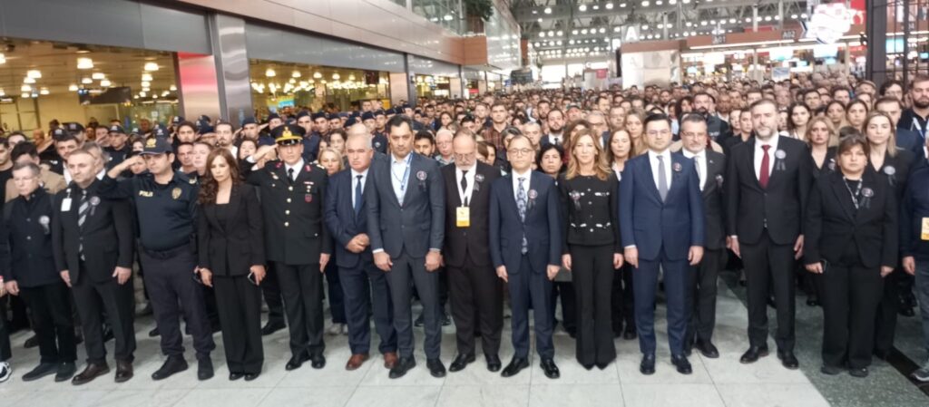 Saat 9’u 5 geçe sirenlerin çalmaya başlamasıyla Atatürk’e duyulan sevgi, saygı ve minnetin göstergesi olarak pasaport kontrolden check-in kontuarlarına tüm terminal genelinde Ulu Önder Mustafa Kemal Atatürk için saygı duruşunda bulunuldu, ardından İstiklal Marşı okundu.