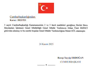 Devlet Hava Meydanları İşletmesi (DHMİ) Genel Müdür Yardımcısı Erhan Ümit Ekinci görevden alındı.