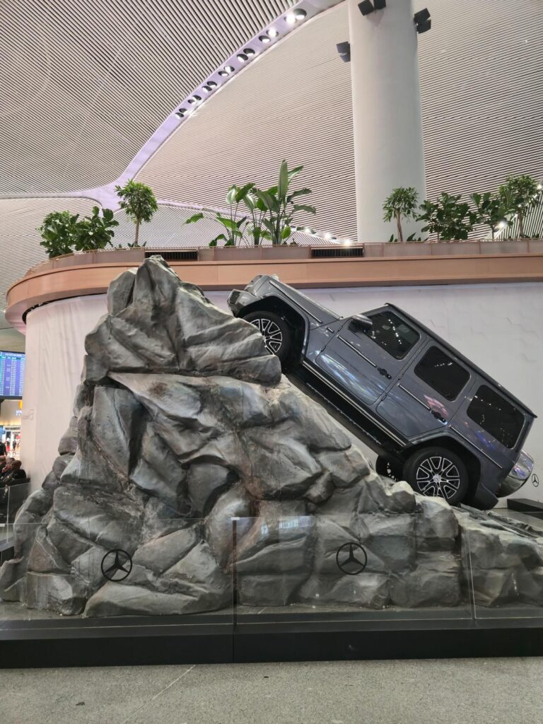 Bosphorus alışveriş alanında sergilenen Mercedes-Benz G 580, doğal kaya formu üzerinde konumlandırılarak markanın arazi gücünü ve elektrikli geleceğini bir araya getiriyor. Gerçek bir tırmanış hissi uyandıran bu dinamik kurgu, Mercedes-Benz’in yenilikçi ruhunu İGA İstanbul Havalimanı’nın modern mimarisiyle bütünleştiriyor.