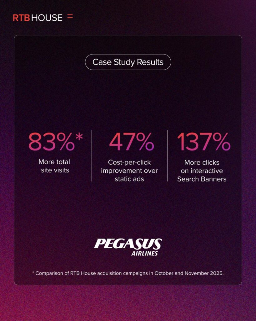 Pegasus Hava Yolları, Almanya pazarında yürüttüğü Search Banner kampanyasıyla RTB House’dan gelen site ziyaretlerini yüzde 83 artırırken, tıklama başı maliyette (CPC) yüzde 47 iyileşme sağladı