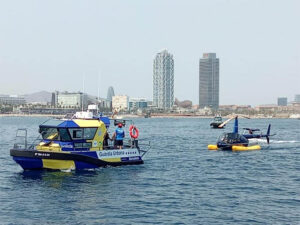 Robinson R44 Raven II tipi helikopter, Barcelona’nın Ciutat Vella bölgesindeki La Barceloneta sahili açıklarında deniz acil indi.