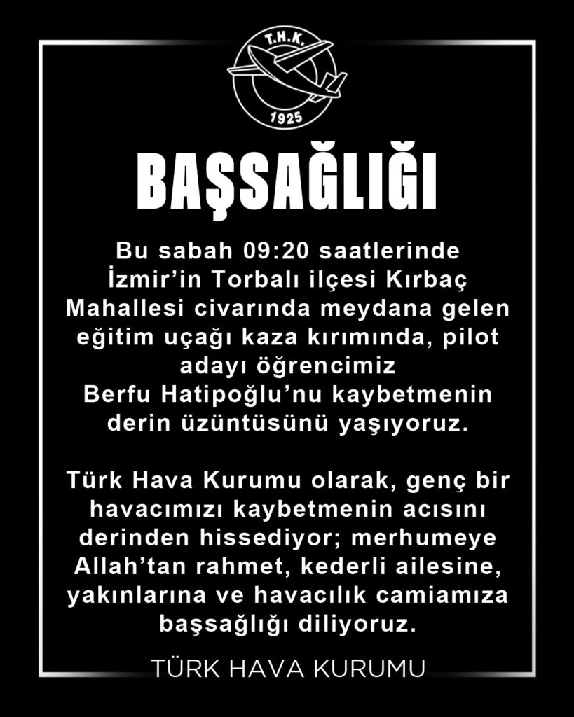 İzmir’in Torbalı ilçesinde düşen eğitim uçağının pilotu ile ilgili Türk Hava Kurumu başsağlığı mesajı yayınladı.