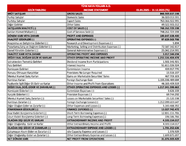 THY 2025 yılı geçici vergi gelir tablosunu açıkladı